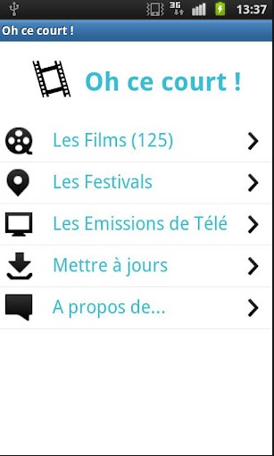 L’application vous permet également de visionner des émissions de télévision dédiées aux courts-métrages et aux différents festivals. Vous retrouverez tous les courts-métrages classés par catégories, ou pourrez choisir de les visionner au hasard. L’application vous offrira la possibilité de gérer très facilement vos favoris. L »application vous permettra d’en recommander à vos amis via Twitter et Facebook, ou encore par e-mail, SMS, …
