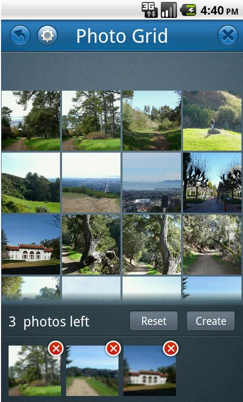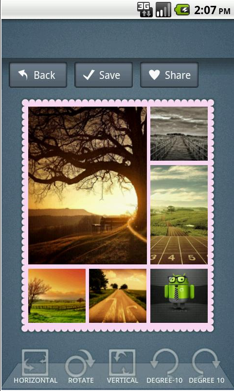 Convertissez votre collection de photos en collages étonnants. Personnalisez votre planche à photos, éditez et organisez les clichés et sélectionnez un modèle d’affichage (templates disponibles). Les bordures sont personnalisables et vous avez le contrôle total sur toute la présentation. Enregistrez le résultat sur la carte SD et exportez sur Twitter, Facebook, Gmail… voilà ce que vous propose cette appli.
