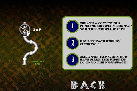 Le but du jeu est simple. Vous avez une arrivée d’eau matérialisée par une vanne avec un volant et une évacuation au sol où est déjà positionné le dernier élément de votre future canalisation. En plus de cela, vous avez différents raccords, coudes, tés et croisillons que vous devrez faire pivoter en appuyant dessus afin qu’ils se raccordent correctement entre eux jusqu’à former la canalisation qui reliera la vanne à l’évacuation. Tous les morceaux ne servent pas, et attention aux fuites !