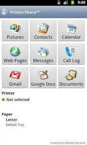 Imprimer des documents à partir de votre carte SD et de Google Docs, des messages Gmail, des photos, des contacts, un agenda, des sms/mms, un journal des appels et des pages Web directement à partir de votre téléphone vers une imprimante proche de vous ou n’importe où dans le monde.