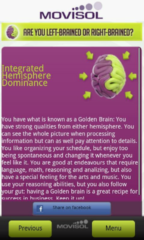 Si vous souhaitez en savoir un peu plus pour le votre, téléchargez cette application Quel hémisphère de ton cerveau très bien faite et facile à utiliser. La seule chose à faire ici sera de répondre à des questions simples et en toute sincérité. En fin de questionnaire, vous saurez enfin si ça bosse plus à droite qu’à gauche.