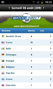 Cette application est l’une des meilleures du genre. Au-delà des résultats, Résultats Foot en Direct vous propose, entre autres, de recevoir des alertes par notifications push lorsqu’une équipe marque un but. Nous devons cette excellente application à l’équipe de MatchEnDirect.fr qui, forte de son succès, a décidé de développer Résultats Foot en Direct pour les Smartphones sous Android.