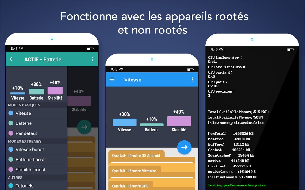 L’élément intéressant avec Root Booster c’est que les modes proposés sont vraiment très clairs et parfaitement intuitifs. L’utilisateur un peu perdu s’y retrouvera facilement avec une interface tout en français. Vous voulez que votre smartphone aille plus vite alors cliquez sur « vitesse boost ». Besoin d’optimiser la batterie ? Alors cloquez sur « batterie boost ». C’est aussi simple que cela.