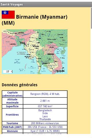 Vous pourrez par exemple consulter la carte du pays, ses données générales (nom de la capitale, superficie, monnaie, langue parlée, décalage horaire, etc.) mais également bénéficier de liens internes qui vous dirigerons vers les informations météo ou encore des taux de change, de la liste des moyens de transport intérieurs, etc.