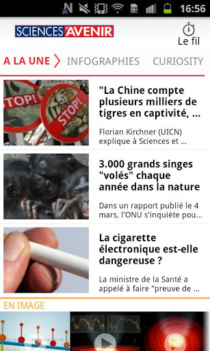 Vous pourrez également vous inscrire directement aux Newsletters de Sciences et avenir directement depuis l’application ou bien vous faire alerter sur les dernières actualités (que vous pourrez paramétrer à votre guise). Enfin, si vous aimez certains articles, vous pourrez les commenter depuis l’application ou encore les partager par email, Facebook, Twitter, Google+ et LinkedIn.