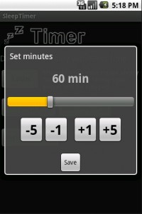 SleepTimer est donc un timer qui vous permet de définir un délai avant que votre mobile ne cesser de diffuser de la musique et ne se mette en veille. Il est toujours agréable de s’endormir en musique, il vous sera possible de définir un délai d’arrêt (le délai d’une minute permet principalement de tester l’application ou alors, vous vous endormez vraiment très très vite !).