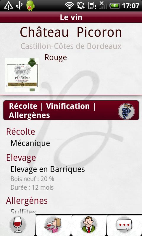 Lorsque vous êtes dans votre rayon et hésitez entre plusieurs bouteilles, cette application gratuite peut vous donner, grâce à son catalogue de fiches de vin, l’accord met-vin, le cépage, le terroir, la récolte, les récompenses ou encore des informations sur le château avec pour certains des photos et des vidéos.