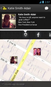 Cette application gratuite permet d’établir le contact avec nos amis lorsqu’ils sont géographiquement proche de nous. Sonar offre un système de géolocalisation de vos connaissances (et de personnes qui pourraient vous intéresser) assez pointu. Il établira vos recherches à partir de vos centres d’intérêts et de vos proches sur les réseaux sociaux.