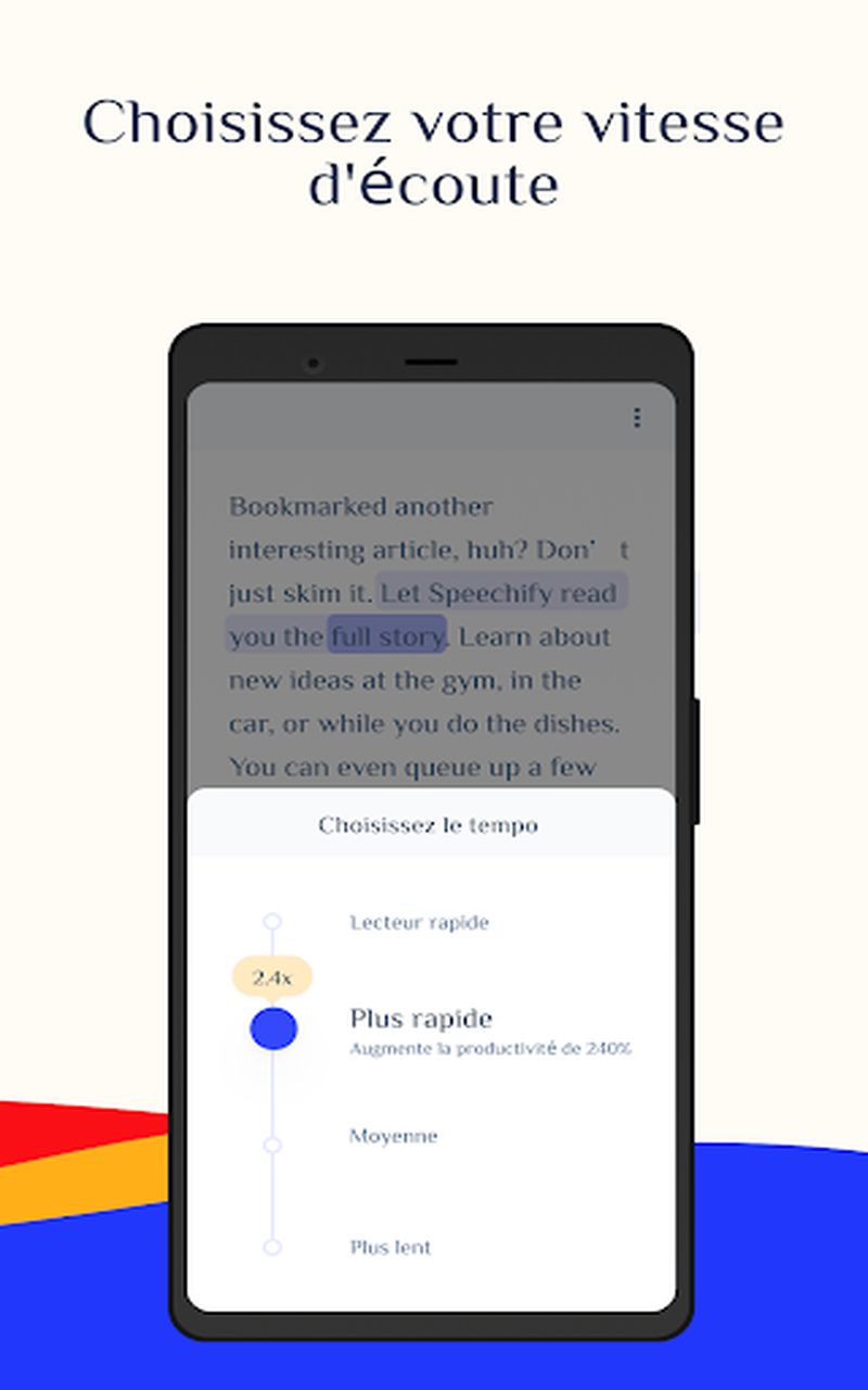 Bonjour à tous et bienvenue sur nos pages pour y découvrir sans plus attendre la présentation de l’application Speechify. il s’agit d’une app en partie gratuite (c’est un de ses défauts, nous en reparlons) proposé par les studios du même nom sur Android. Elle vous permettra de transformer les textes écris en textes lus oralement par des voix contrôlées par une intelligence artificielle. C’est une application qui se destine principalement aux personnes qui ont des difficultés de lecture dues, par exemple, à des problèmes de dyslexie ou autre. cela leur permettra d’accéder à leur titre préféré sans avoir à le lire, mais en écoutant.