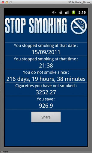 - Voir des statistiques détaillées (temps depuis votre arrêt, nombre de cigarettes que vous n’avez pas fumé, argent que vous avez économisé,…)