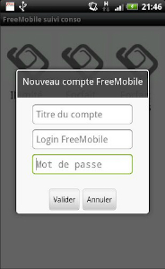 Il suffit au premier lancement de l’application de renseigner une bonne fois pour toutes 3 informations : le titre que vous souhaitez lui donner, votre login FreeMobile ainsi que le mot de passe associé, c’est tout.