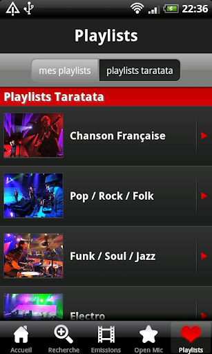 - PLAYLISTS : créez et gérez ici vos propres playlists et accédez aux playlists Taratata générées par genres et à écouter en continu.