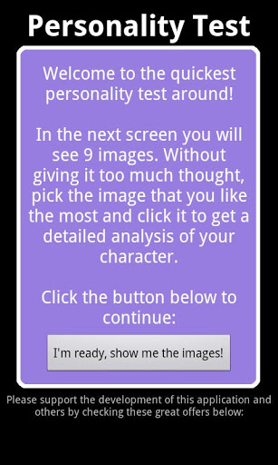 Envie d’en savoir un peu plus sur vos qualités et vos défauts ? Besoin d’en découdre avec vos travers ? Ou simplement, vous êtes animée par la curiosité et souhaitez mieux vous connaître? Voici le Kit, presque complet, qui vous permettra de faire passer plutôt simplement et rapidement un test de personnalité à vos amis, ou à vous-même. Cette application est faite pour le divertissement seulement. Bien qu’elle se révèle être assez bien précise, il ne s’agit pas d’un vrai test psychologique.