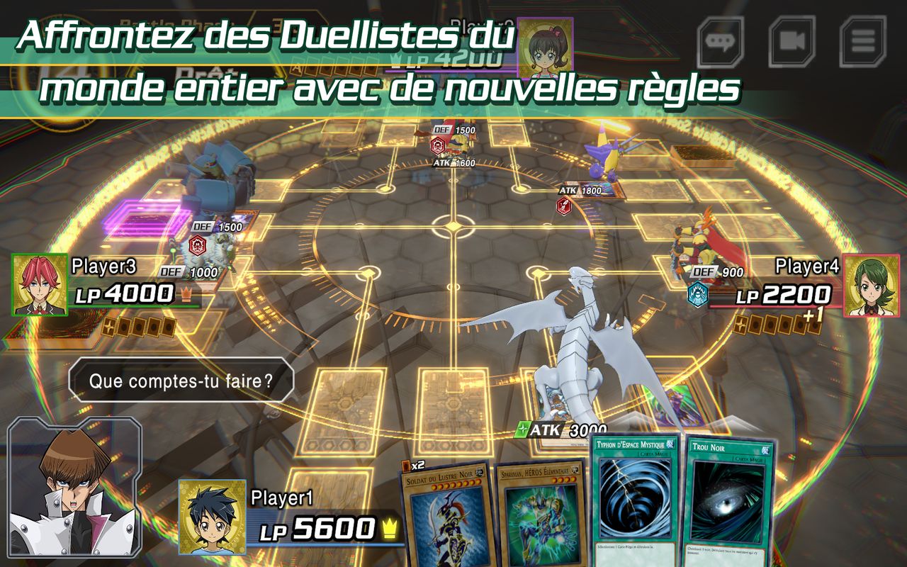 Si Duel Links (celui qu’on vous a présenté) permettait de découvrir les adaptations possibles avec des parties rapides, Master Duel offrait une expérience très proche du DA avec une quantité de cartes astronomiques. Ici, on découvre donc de nouvelles possibilités. Les parties se jouent à quatre et des lignes relient chacun des quatre joueurs. Chacun peut invoquer 3 monstres et poser 3 cartes pièges. Chacune des parties dure 8 tours et suit un ordre établi que vous découvrirez. Gardez simplement en mémoire que la ligne central permet un affrontement entre tous les monstres, que les autres affrontements opposent les monstres qui sont sur la même ligne et qu’après un premier tour vous pourrez ajouter des cartes de magie qui augmenteront les différentes capacités de vos monstres. Le gagnant est celui qui a réussi à tuer tous les autres ou bien qui reste debout avec le plus de PV.