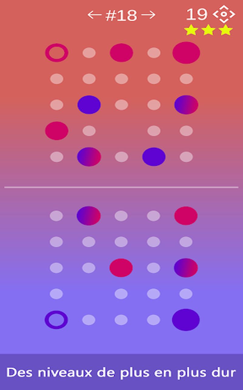 Vous allez en effet devoir connecter des boules de couleurs en tenant compte d’un autre écran situé sous le premier. A chaque mouvement que vous allez faire, un autre mouvement sera associé, en miroir. Le joueur doit connecter tous les points rouges en finissant par le cercle rouge qui est la fin du niveau. Dès que le joueur effectue un mouvement, par exemple vers le haut, un mouvement vers le bas est effectué dans la zone bleue.