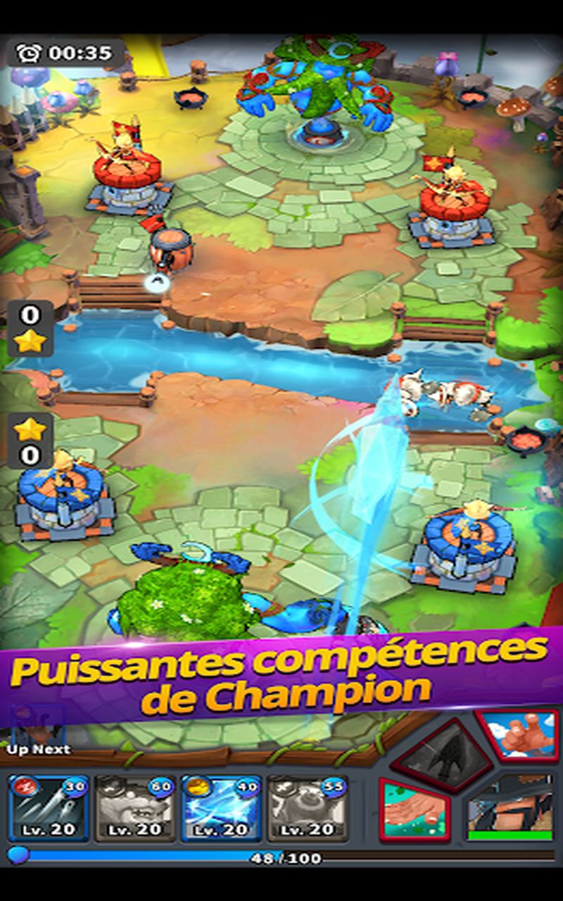 Voici la présentation et le test complet du jeu de type Clash Royale, Nano Legends sur Android. Il vient tout juste de sortir et est proposé par Nimble Neuron. Il ressemble comme deux gouttes d’eau au jeu des studios Supercell de part sa présentation et son gameplay. Vous vous affronter sur une carte divisée en deux par un lac ou une rivière, en tous cas une séparation, vous avez trois parties de votre base, trois monstres qui ne bougent pas et vous pouvez lancer vos équipes pour tuer ceux de vos adversaires. Comme pour le concurrent, vous avez un temps de recharge pour pouvoir lancer vos unités et lorsque vous tuez le monstre central, alors vous gagnez, même si l’un des deux autres est encore en vie.
