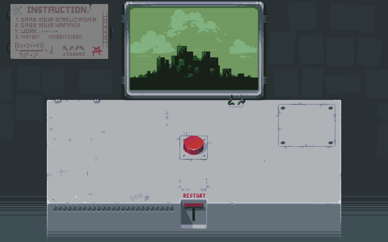 C’est très difficile de décrire et de présenter un jeu comme celui-là sans en dévoiler tout le charme. Car oui Please Don’t Touch Anything est définitivement accrocheur et intriguant, mais il faut le découvrir par soi-même. Vous retrouvez dans une salle devant un écran et avec une console avec un gros bouton rouge. Bien évidemment, le truc tentant est d’appuyer sur ce bouton. Oui, sauf qu’en fait on s’aperçoit vite qu’on peut faire apparaître d’autres éléments.