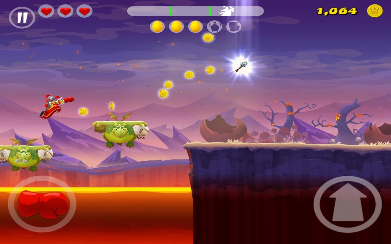 Autant le dire tout de suite, SirVival ne révolutionne pas le genre. Mais pour autant c’est un vrai bon petit jeu gratuit, très bien réalisé. Comme dans tous les running game, vous ne contrôlerez pas la course de votre cheval. Non celui-ci court tout seul et avance tout seul. Vous aurez par contre à gérer les sauts et les attaques. Ces dernières sont assez simples: attaques frontales via le gros poing rouge (qui vous sert de lance) et saut « écrasé » au sol notamment. Bien entendu vous pourrez en obtenir de nouvelles grâce aux différents bonus à récupérer sur le chemin. Pas de soucis pour la jouabilité dans SirVival: les deux gros boutons tactiles en bas de l’écran sont assez visibles, vous ne trouvez pas ?