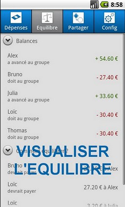 • Equilibre: ce que chacun doit en fonction de ces dépenses et la façon la plus simple d’équilibrer