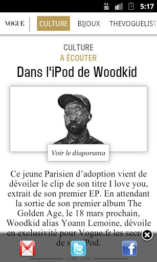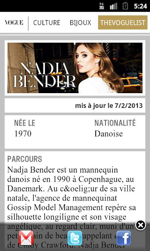 Enfin, si vous cherchez des infos sur un mannequin, pas de souci, Vogue Paris vous fournira une biographie complète des mannequins les plus connu(e)s. Bien entendu, vous aurez la possibilité de partager le contenu de votre choix par mail, sur Twitter ou sur Facebook.