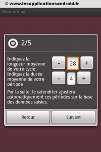 Quand vous lancez l’application, elle vous demande en premier lieu de renseigner la durée moyenne de votre cycle de menstruation. Ne vous inquiétez pas si vous n’êtes pas sûr de vous tout cela pourra être modifié par la suite.